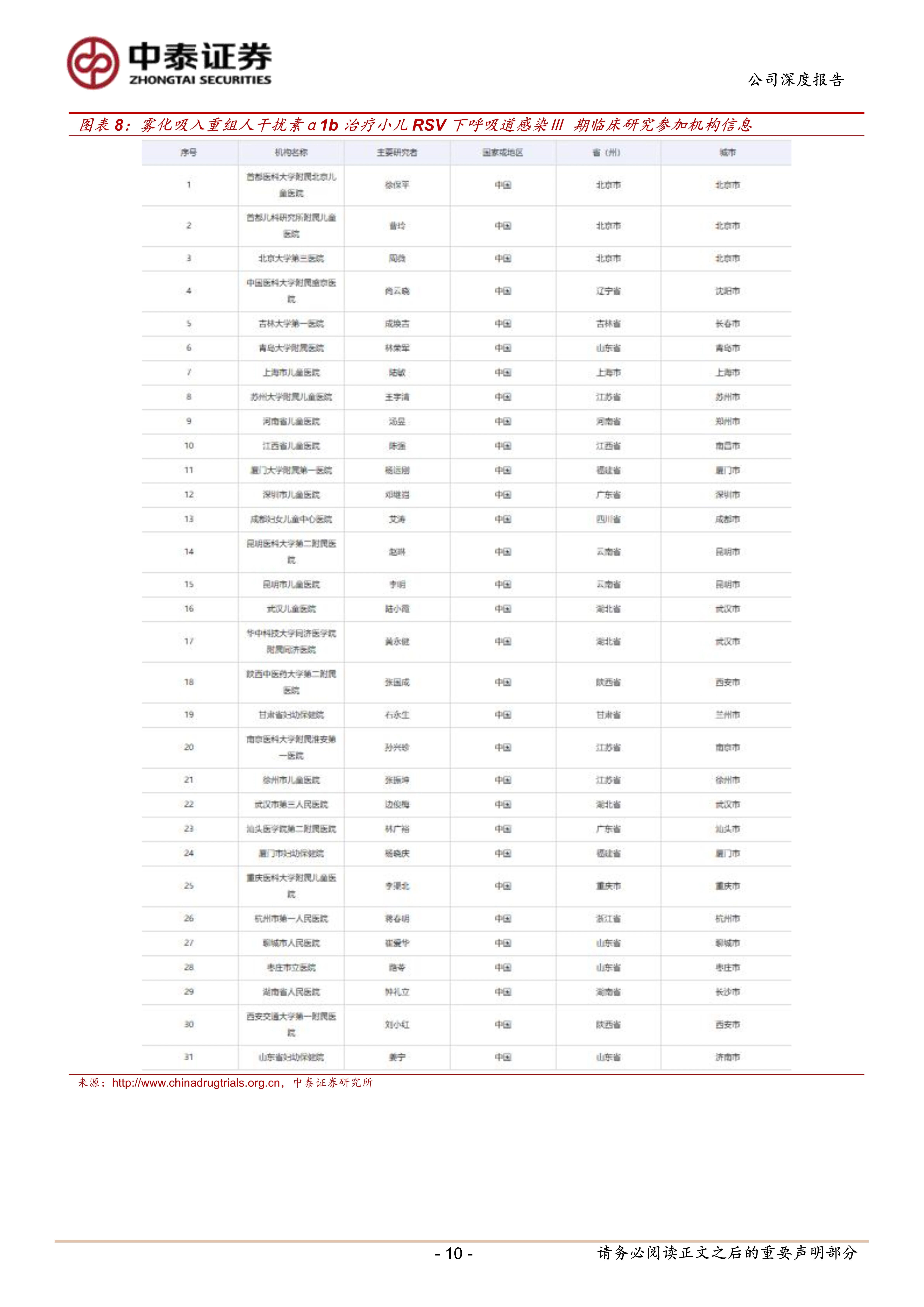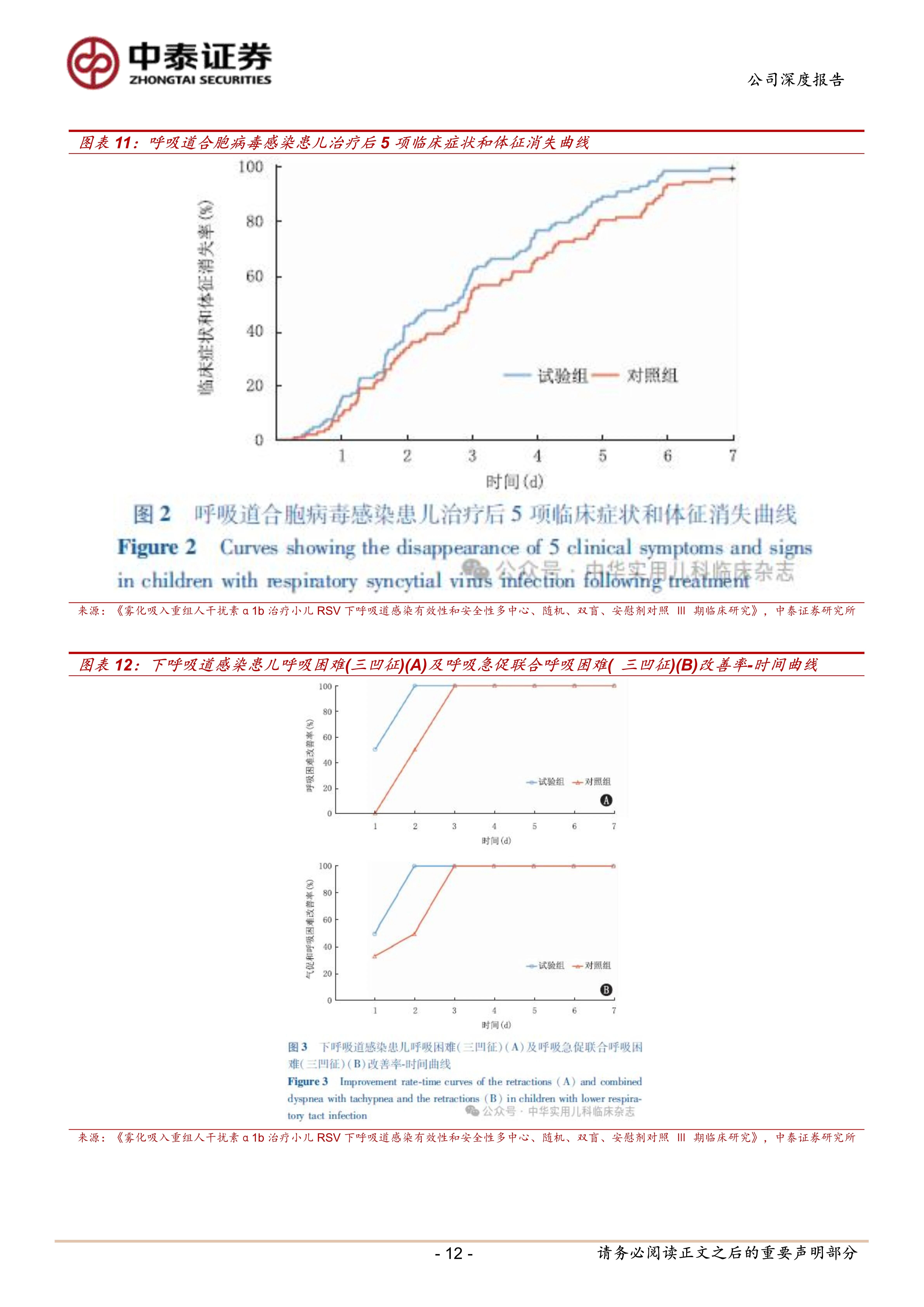 安全垫:重组人干扰素α1b大市场,新剂型良好接续。公司通过建立重组蛋白高稳定性水溶液技术平台,成功开发了干扰素等细胞因子药物的水针剂、喷雾剂、滴眼液、预充式注射剂、卡式笔多剂量注射剂、微针、雾化吸入剂等产品。已上市的运德素®传统剂型放量良好,在研核心产品人干扰素α1b雾化吸入剂针对小儿呼吸道合胞病毒(RSV)肺炎上市在即,市场潜力巨大。该药物若获批,将成为国内首个RSV雾化治疗药物,填补市场空白。