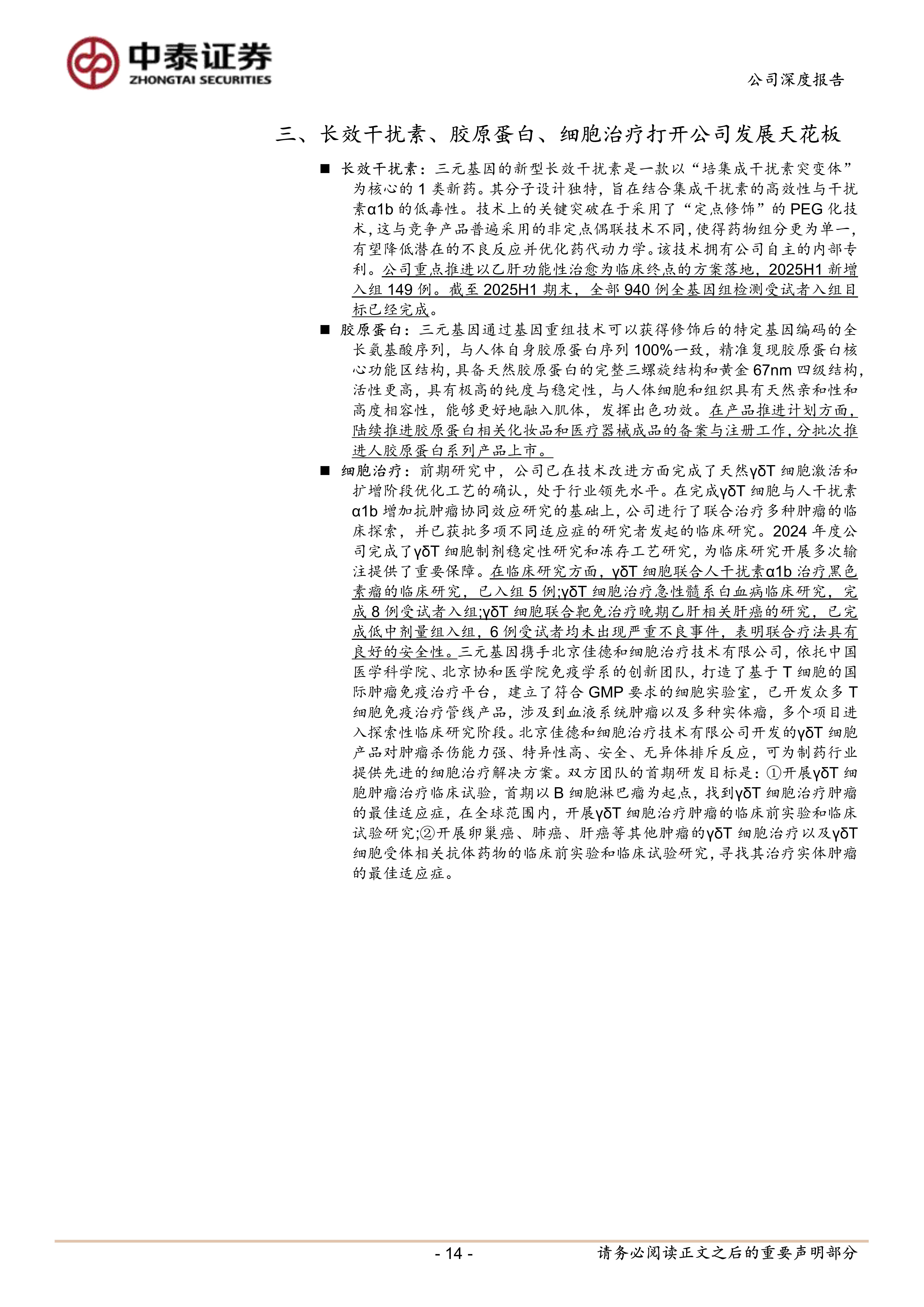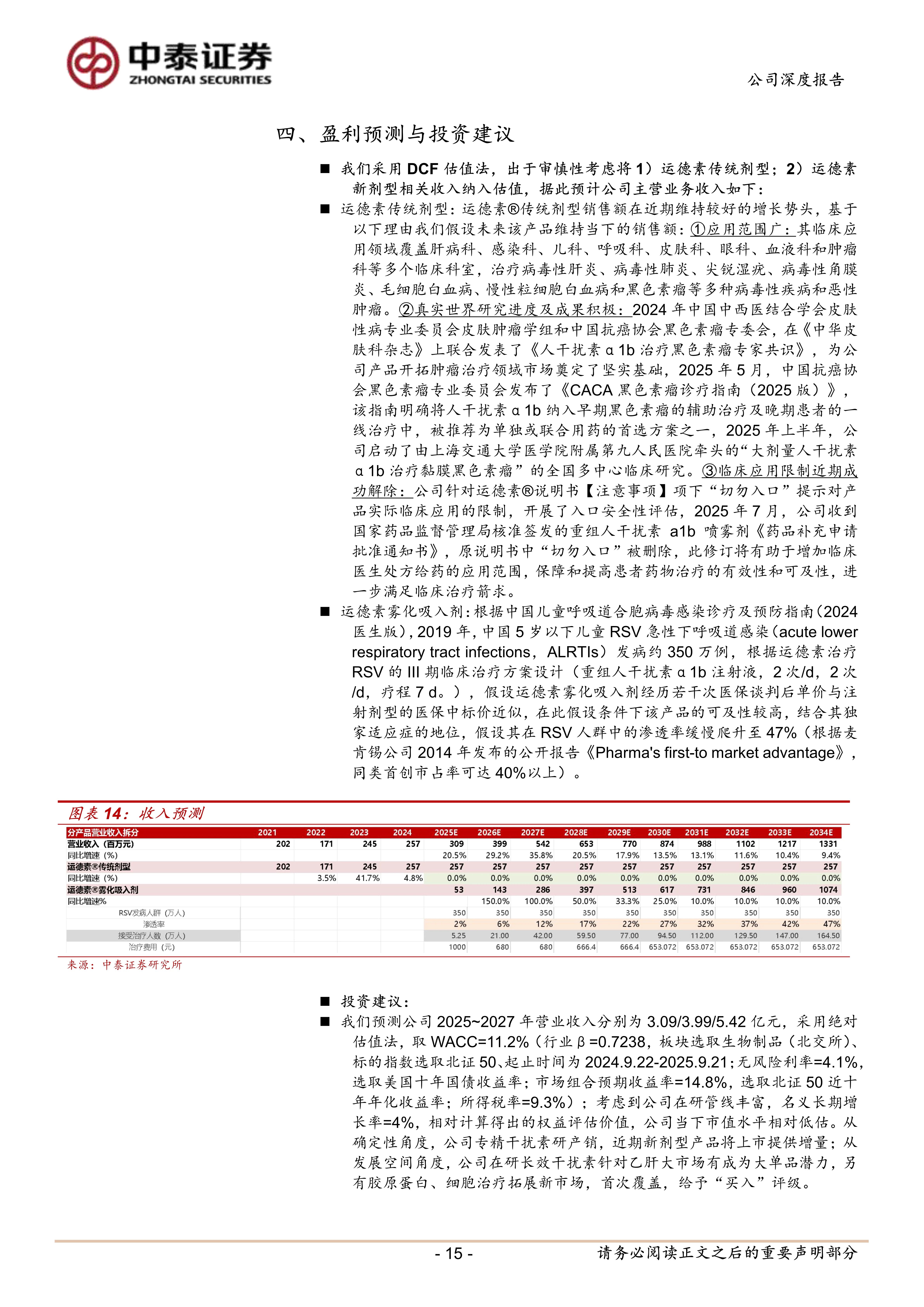 盈利预测、估值及投资评级:我们预测公司2025~2027年营业收入分别为3.09/3.99/5.42亿元,采用绝对估值法,取WACC=11.2%;无风险利率=4.1%;市场组合预期收益率=14.8%、名义长期增长率=4%,相对计算得出的权益评估价值,公司当下市值水平相对低估。从确定性角度,公司专精干扰素研产销,近期新剂型产品将上市提供增量;从发展空间角度,公司在研长效干扰素针对乙肝大市场有成为大单品潜力,另有胶原蛋白、细胞治疗拓展新市场,首次覆盖,给予“买入”评级。