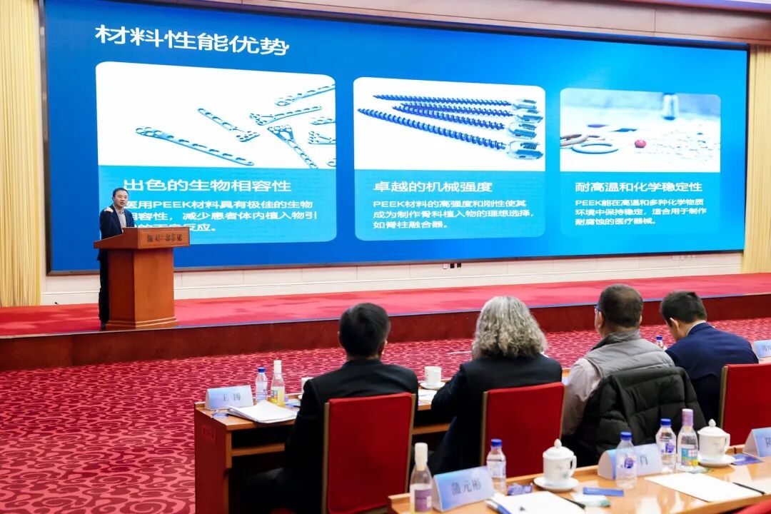 会议中场环节,川大北京创联校友发展顾问、川大技术转移集团董事兼COO李君辉校友带来高端医用聚醚醚酮材料及器械全产业链国产化的项目发布,他从医用peek材料特性及应用场景、国内外市场现状、项目创始团队优势和产业链国产化布局角度进行了系统的展示和讲解。