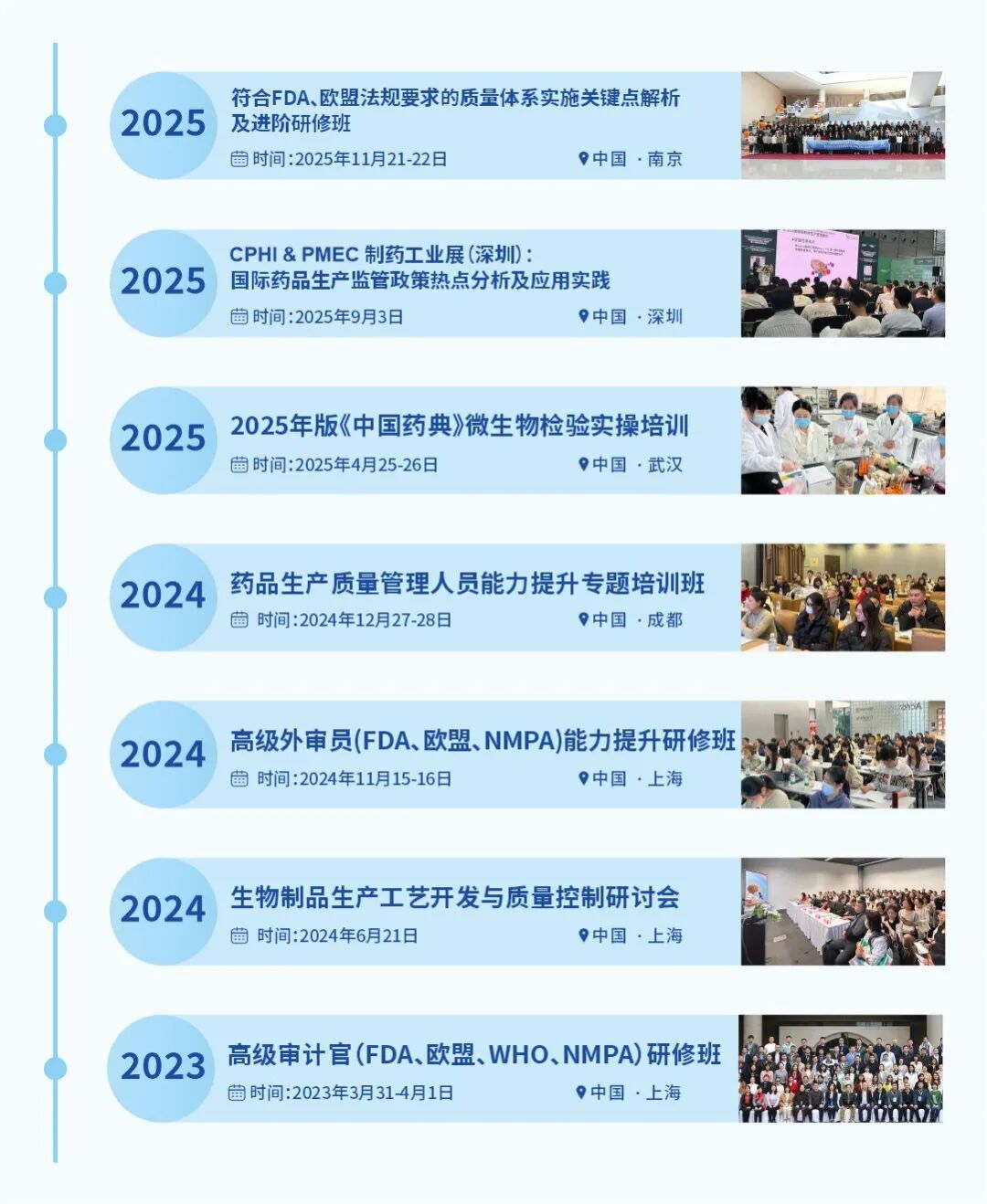 为满足全国更多制药企业的学习需求,本系列“符合FDA、欧盟法规要求的质量体系实施关键点解析及进阶研修班”将于近期相继在上海和广州开班,持续为中国制药行业的质量管理与国际化发展注入专业动力。