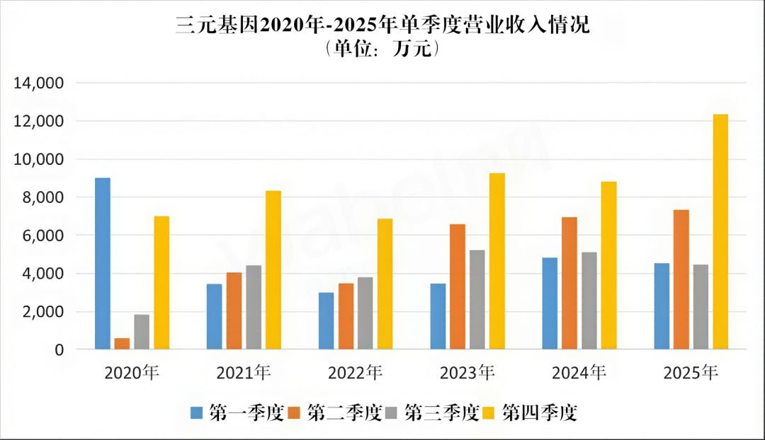 2025年第四季度,三元基因营业收入规模为1.23亿元,环比增速达到176%,同比也提升了40%。拉长时间周期来看,公司去年四季度营收是自2020年公布季度数据以来的最好水平,首次实现单季营收突破亿元大关。